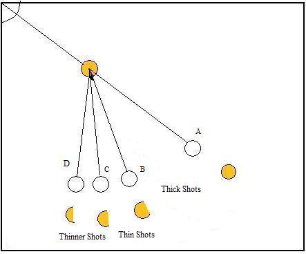 As shown in the figure above, any cue ball position between C and D will be a thinner shot with respect to a straight shot A. One can see there will be fewer shots in between C and D that will fall into a thinner shot. Cut out portions in shot positions between C and D are just hidden or not seen part of the object ball with respect to a full hit or straight in shot.